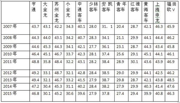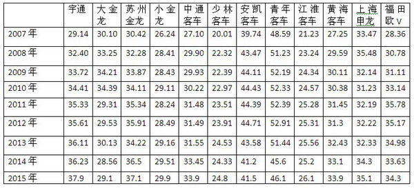 4、中档客车比例在30-35%之间有大、小金龙。但这两企业在价格定位策略上有很大差异:大金龙是客车行业的优势品牌之一,以前是以做中高档旅游客车见长,产品定位就是中高档客车,其产品单价的比例有45%左右是在30-50万之间的,发展到了2010年以后,为了进一步扩大市场份额,把产品线往下延伸了一部分,开始进入5米以下的轻客市场,因此,上述表格中从2010年开始其在30-50万之间的产品档次的比例开始下降了。而小金龙由于一直把轻型客车作为其增大销量的重要筹码,因此其在30-50万之间的产品单价比例自然就不会太高,但其在大中型客车领域的实力也不可小视。