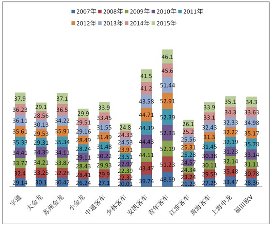 3、2015年前11月销售单价落在20-30万之间的有大金龙、小金龙、少林客车和江淮客车,这些企业的产品定位也有特色:少林客车一直以中巴为主,以主打农村客运和公交市场见长,在这一细分市场中做得较好;江淮客车与少林客车基本类似,但中高档客车的比例要大于少林客车,大小金龙主要是轻客销量较大,拉低了整个客车的均价。