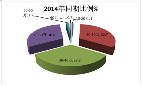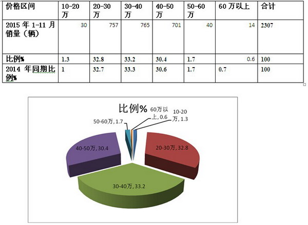 1、2015年1-11月,40-50万和30-40万、20万-30万三个价格区间,是CNG客车销量最大的三个主力区段,几乎各占据总体销量的94.5%。其余区间销量较少,销量分布出现了“两头小,中间大”的市场迹象。