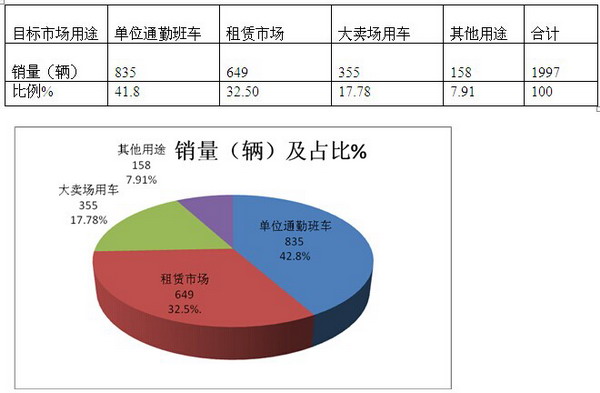 从上图表可以看出:单位通勤班车是北京、天津区域团体车最大的目标细分市场,其比例达到41.8%,其次是租赁市场,比例达到32.5%,再次是大卖场用车市场,比例达到17.78%。