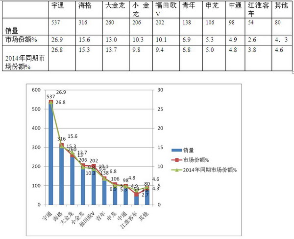 2、“三龙”品牌也不示弱,其中海格份额最大,其次是大金龙,再次是小金龙。“一通三龙”等一线品牌在京津地区的市场份额累计占据了65。8%,比2014年同期上升了近0.8个百分点,说明一线品牌集中度在加强(其中大金龙下降)。