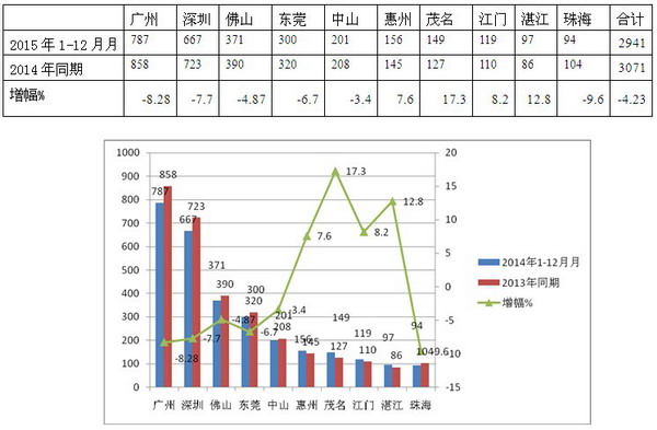 1、 广东区域市场是全国市场容量最大的公路客车市场,2015年1-12月共销售公路客车3858辆,比去年同期4052辆下降了4.8%。