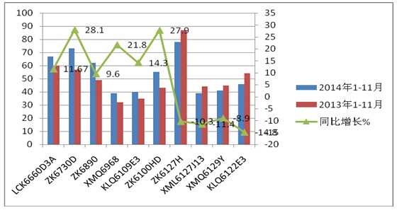 2、11-12米公路销量最大,但同比下降8.05%,9米以上大型公路客车同比均下降,而且降幅大部分在10%以上。