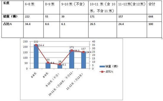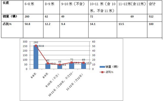 从上图表可见,6-8米长度段占据了江苏区域纯电动客车近50.8%的市场权重,也就是说超过一半的纯电动客车是6-8米长度段。其次是10-11米,再次是11-12米,第四是8-9米,且10-11米、11-12米及8-9米销量比例相差不大,但都远远落后于6-8米长度段。