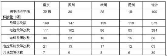 从上表看出,南京、苏州、常州、扬州四个区域市场的抽样的纯电动客车在运营中出现故障频次最高的均是电池故障,而且占比都达到65%以上,换言之,纯电动客车出现故障的主要原因是由于电池技术质量的不过关导致的。