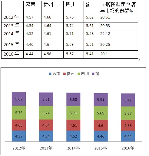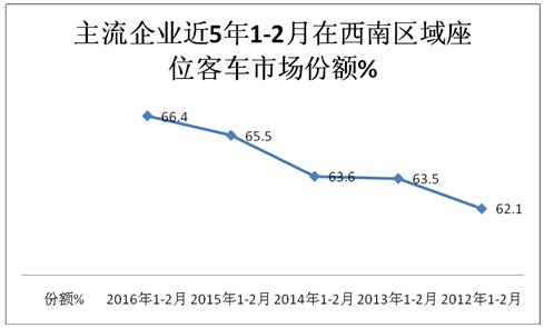 根据上牌数据查阅计算,主流客车企业2016年1-2月及近5年在云、贵、川、渝主流区域座位客车市场份额与比较表(%)