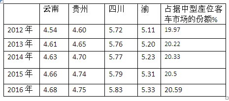 (五)大型客车受到动车、高铁的挤压,无疑销量下降,但上面分析过云、贵、川、渝凭借经济特点和铁路竞争状况稳住了大型座位客车市场份额。有些经营大型座位客车的经营者们由于被动车、高铁抢走了客源,不得已转行卖掉大客车放弃客运市场而购买中型客车去搞旅游和团体租赁业务,因此中型客车市场份额有所上升。