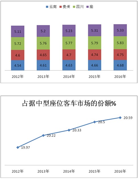 1、云、贵、川、渝区域人口密度虽然不算大,但面积较大,且大部分地区都处于多山地区,是中国经济较发达的欠发达区域,火车较少,交通工具主要还是依靠公路客运。根据不完全统计,上述4大地区的公路总里程数大约占据全国的五分之一,公路交通较发达,这从客观上给座位客车提供了市场。对座位客车的需求量较大。