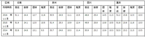 2016年1-2月 大西南(云、贵、川、渝)地区座位客车市场特点剖析