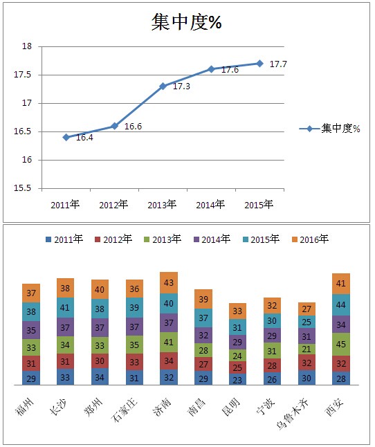 1、福州、长沙、郑州、石家庄、济南、昆明、西安等全国二线十大城市是10-11米公交的主要销售区域之一,10-11米公交的市场集中度始终在16%以上,占据了五分之一---六分之一的市场份额。