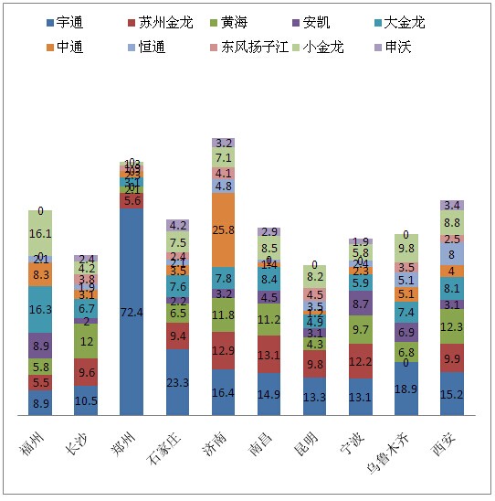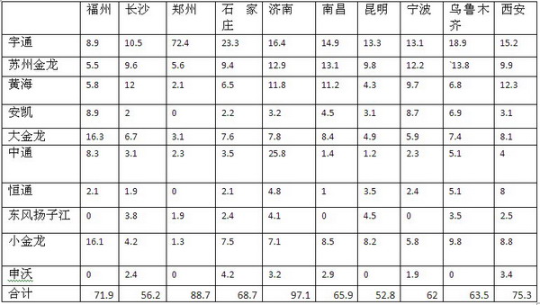 %-30%左右),10-11米公交约占公交总销量的比例大约在21%-25%之间,是大中城市主干线路的重点车型,尤其是二线城市的主打公交车型,因此也是各重点区域市场的采购重点车型,对整个公交市场的影响可以说举足轻重,因此研究分析10-11米公交市场尤其是重点二线城市的10-11米公交市场就显得非常重要,下面以2016年1-2月福州、长沙、郑州、石家庄、济南、南昌、昆明、宁波、乌鲁木齐、西安等十大二线城市的10-11米公交市场情况作为对象来分析之。