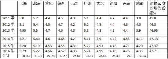 十大城市在9米以下公交市场的份额总和占据了公交市场的份额一直在23.7-26.5%之间,并且是逐年下降的,即从2011年的26.5%逐年下降到2016年的23.7%.