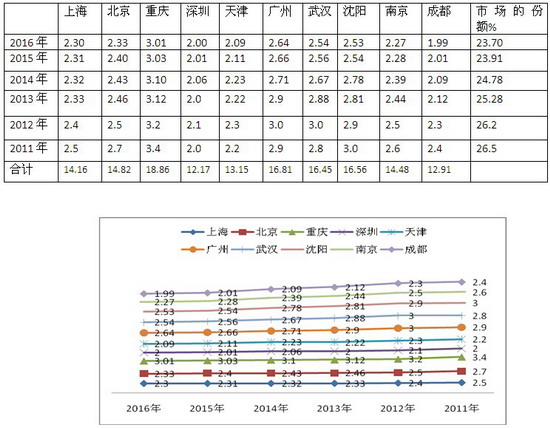 2、近6年来,在上海、北京等十大城市中,除去重庆区域的市场份额是逐年上升的外(从2011年的3.25%逐年升高到2015年的3.43%.2016年又下降到3.41%),其余城市的公交市场份额都是忽高忽低,无一定规律可循.