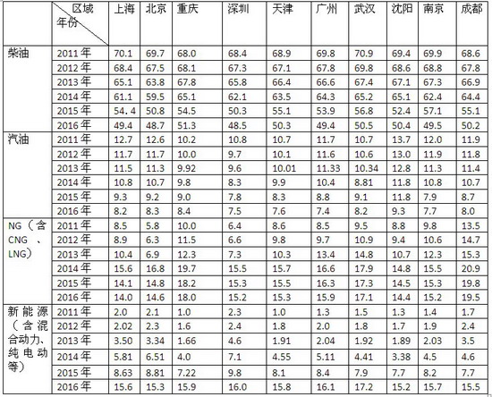2、在十大城市中,传统柴油燃料仍然是公交的主要配置,但正在呈现逐年下降态势,NG类是节能公交客车从2015年开始下降,汽油类产品也呈现逐年下降趋势,新能源客车呈现逐年上升态势,上升空间很大。