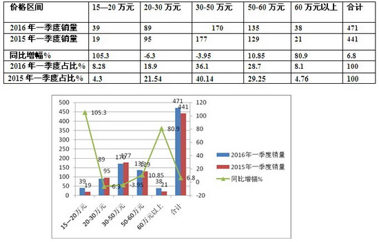 从上图表看出:30万-50万价格区间是2016年1-3月上海区域销量最大的团体客车市场,而且占据比例同比下降近4个百分点;其次是50万-60万,但占据的比例同比有小幅度下降;再次是20-30万,但占据的比例同比也下降;最小的是60万以上的价格,占据的比例同比有较大幅度的提升,且15-20万占据比例也在上升。根据市场调研得知,主要是因为纯电动客车已经部分进入上海区域团体客车市场,拉升了2016年1-3月上海团体客车的价格。按价格划分销量,存在“两头小,中间大”的现象;即15-20万的低档和60万以上的高档团体车市场较小,但两头都处于上升态势。而20-60万之间对应的团体客车销量较大,这给团体客车企业在产品定价方面提供了较好的参考。