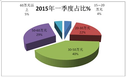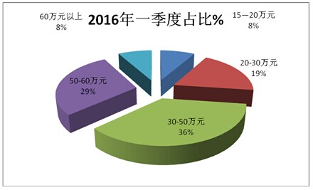 3、按价格区间划分,上海区域市场2016年1-3月团体客车销量结构大致比例如下:
