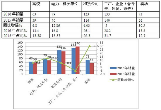 从上图表可以看出,工厂企业是一季度购买团体客车最大的目标群体,但同比有下降趋势;其次是租赁公司,同比有上升迹象;再次是电力部门及机关单位,同比也小幅度上升;最小的客户群体是高校,但同比上升,卖场上升幅度最大,这一分析,给团体客车企业进军上海团体客车市场指明了营销方向。