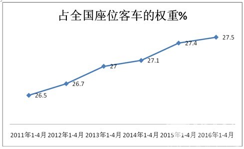 1、近6年1-4月华东五区域座位客车的销量在前2年是增长的,但到了2013年1-4月后却逐年下降。且延续到2016年1-4月仍然下降,但占据全国座位客车的市场权重却一直呈现上升态势,即从2011年的26.5%一路上升到2016年1-4月的27.5%。