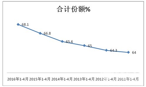 从上图表看出:近6年1-4月华东五区域轻型座位客车市场份额之和占据了总体轻轻型座位市场的份额一直都在27-28.5%之间,但随着年份推移,市场份额逐年在下降,即从2011年1-4月的28.42%逐年下降到2016年1-4月的27.34%。