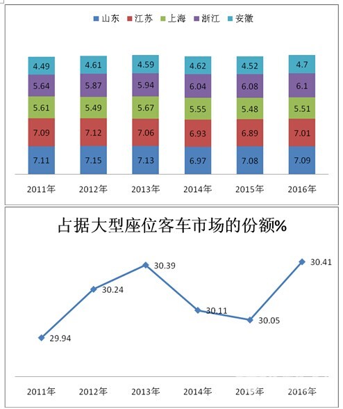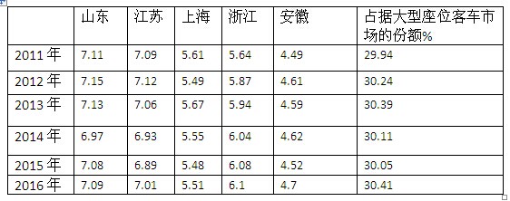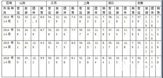 2016年1-4月鲁、苏、浙、沪、皖等华东五区域座位客车市场特点浅析