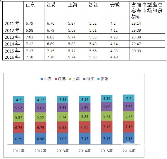4、山东、江苏、上海、浙江等区域都是人口密集区,经济发达,外来务工人员较多,客流量一直处于全国前列,而承担大量客流任务的主要交通工具依然是公路客车,尤其是每逢节假日,火车票一票难求,飞机票又很昂贵,公路客车就必然担负起长途客运的重任,而座位客车又是公路客车的主体。因此,该区域市场对座位客车的需求也必然较多。