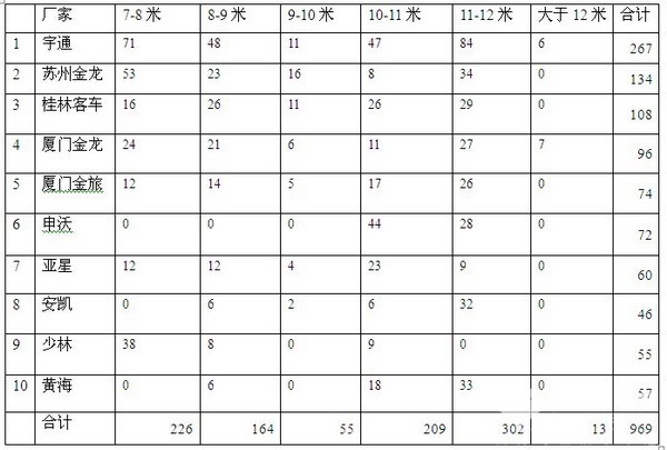 1、销量前10名主流企业共销售969辆,占总体销售1377辆的70.3%,也就是说,前10家主流企业的集中度占广西发生销售的46家企业的70.3%.,其他36家客车企业在广西市场只有29.7%的市场机会.