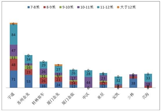 2、广西市场集中度最高的长度段是11-12米段,而且主要是客车老大的宇通客车品牌,其次是10-11米段,再次是7-8米长度段。同时11-12米段也是市场容量最大的细分市场,说明广西的中长途客运比较发达,9-10米段和10-11米段集中度比较低,是相对门槛比较低的细分市场,其他客车企业相对比较容易进入。