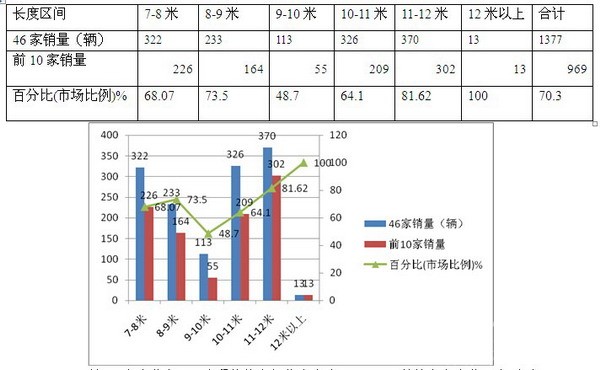 1) 前10家企业在7-8米段的的市场集中度为68.07%,而其他客车企业只有不到32%的市场机遇.
