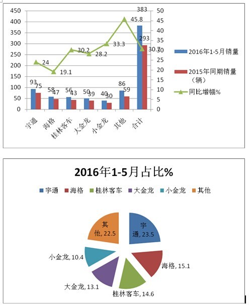 根据上牌数据显示,2016年1-5月广西区域共销售旅游车辆383辆,占据了大中客总销量的27.8%,这一比例明显高于其他区域市场(其他区域的旅游客车比例一般不超过大中客市场的19%左右),也高于其自身市场2015年同期的23%的权重近4.8个百分点,说明广西旅游客车市场正在不断上升。