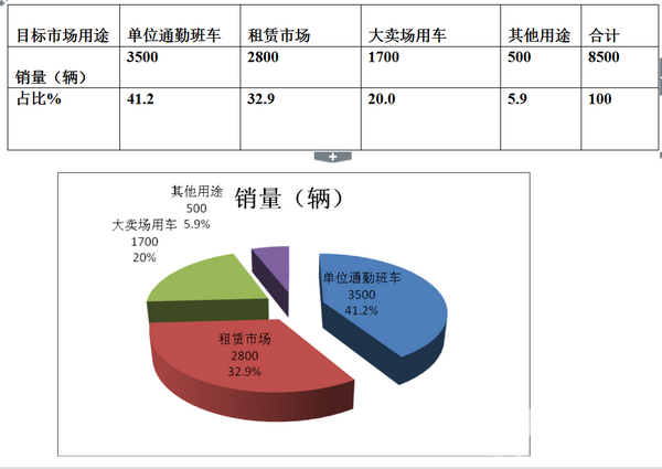 1、按用市场用途划分,根据市场调研上海区域8500辆的团体主要用于租赁、单位通勤班车、卖场接送顾客用车等。大致比例如下: