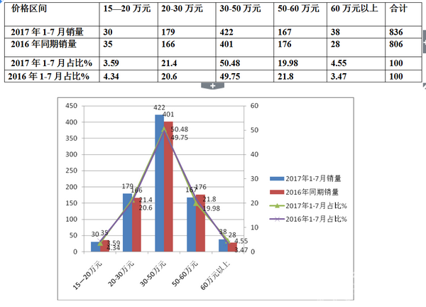 特点三、30万-50万是销量最大的价格细分市场,且同比权重有上升趋势,60万以上是权重次小的价格细分市场,但也有上升迹象,15-20万是最小的低端市场,权重有下降迹象