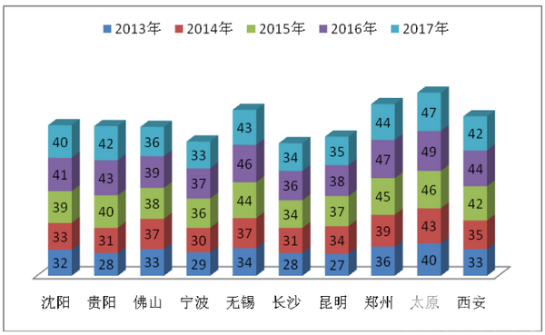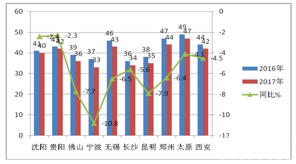 从上图表可知,近4年1-7月,8-9米公交销量在逐年递增,占据当年公交总销量的比例仍然在逐年加大,下面以沈阳、贵阳、佛山、宁波、无锡、长沙、昆明、郑州、太原、西安等在全国各区域具有代表价值的十大二线城市为例来分析2017年1-7月8-9米公交市场特点。