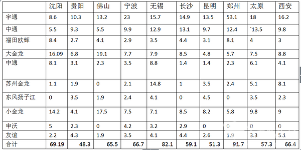 3、属地企业在本地的8-9米公交销量集中度也占有明显的优势。如郑州的宇通在郑州,苏州金龙在无锡,市场占有率都较高。