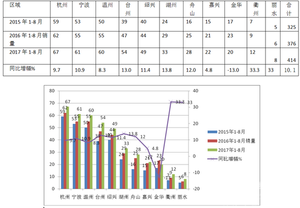 经过对浙江11个地区的各长运公司、高端旅游公司及车管所进行实地调研,2017年1-8月90万以上高档客车及近2年1-8月在各区域的销量分布汇总统计如下表: