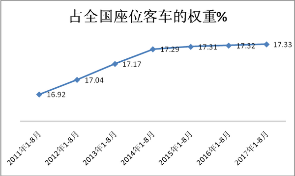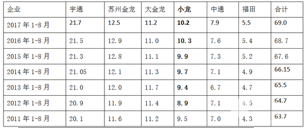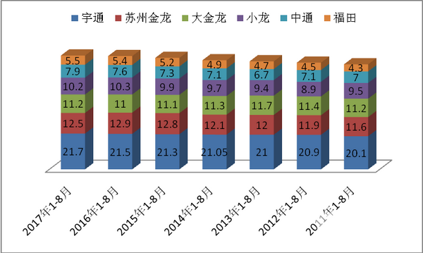2017年1-8月上述主流企业的座位客车在环渤海市场的集中度均稳定在69%,且说明座位客车资源正在向优势企业集中,这种趋势在逐年加强,也正说明环渤海座位客车市场比较注重品牌,客车行业其他三流、四流品牌座位客车在环渤海区域的地位较弱小。