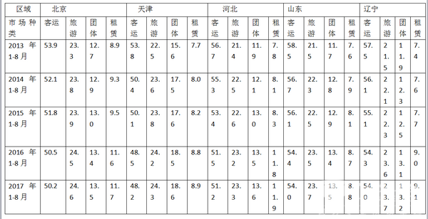 近5年1-8月,环渤海的北京、天津、河北、山东、辽宁等区域,座位客车中的市场份额都在逐步下降,而旅游、团体、租赁与客运市场相反,均在上升。即座位客车中传统占主体地位的客运市场有向旅游、团体、租赁等市场转移的迹象。发生上述现象的原因大致是: