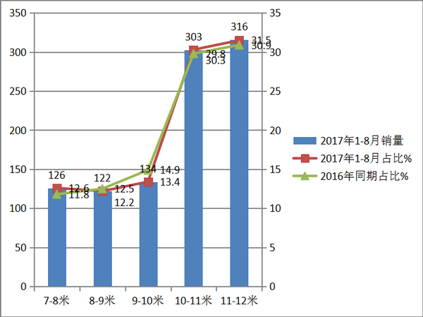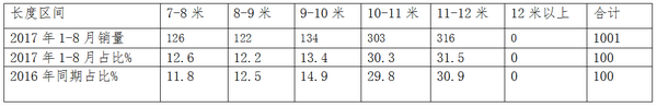 从上图表可以看出: 四川市场,2017年1-8月11-12米是主打产品,其次是10-11米,再次是9-10米,也就是说大型客车是四川旅游客车市场的主打产品。同比2016年同期,7-8米和10-11米、11-12米段旅游客车权重加大,其余则减少,增幅最大的是7-8米段。