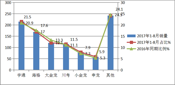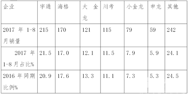 从车管部门监测的数据可知,各主流企业2017年1-8月在四川区域销售的旅游客车统计。