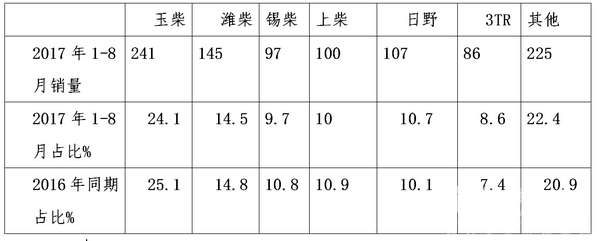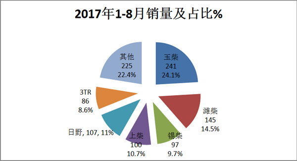 三、按动力品牌划分,对2017年1-8月四川旅游客车销量结构分析---玉柴占比最大,但同比下降,进口发动机偏好日野发动机,3TR(配置川考)占尽地利,权重上升最大。