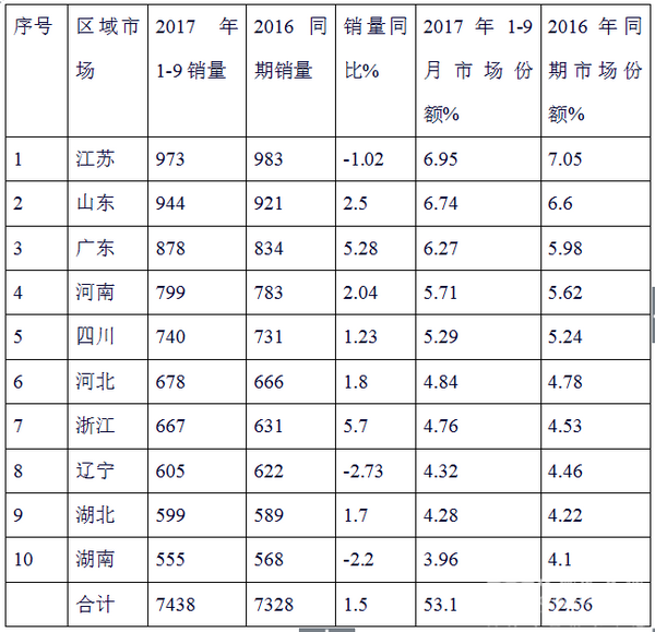 2017年前三季度粤、苏、鲁、豫、川等 十大区域11-12米公路客车市场特点剖析