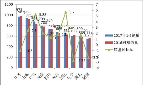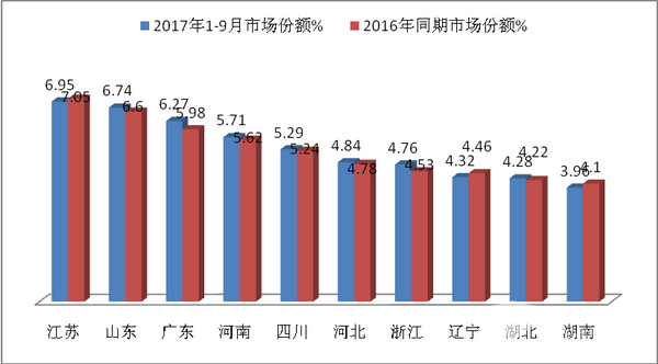 一、2017年前三季度广东、江苏、山东、河南、四川、河北、浙江、辽宁、湖北和湖南十大区域11-12米公路客车市场特点分析