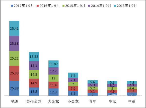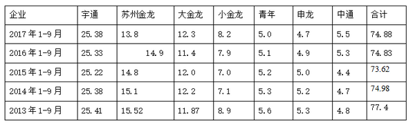 2、 苏州金龙11-12米公路客车销量市场份额第二,同比处于微弱下降态势。