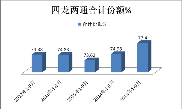 3、前10名重点区域市场11-12米公路客车的市场集中度比2016年同期上升了近0.54个百分点,说明垄断程度在微弱加强。