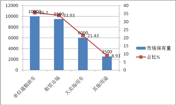 1、按用市场用途划分,长三角区域近28000辆的团体主要用于租赁、单位通勤班车、卖场接送顾客用车等。大致比例如下: