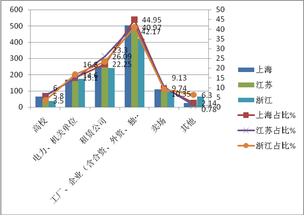 从上图表可以看出,2017年1-10月工厂企业是长三角区域购买团体客车最大的目标群体,其次是租赁公司,再次是电力部门及机关单位,第四是大卖场,最小的客户群体是高校,这一分析,给团体客车企业进军长三角团体客车市场指明了营销方向。就具体到各个区域市场来讲,上海地区的工厂企业购买团体客车占据的额比例最高,可能与上海是中国最大的工业城市,工厂和外资企业众多有关。而租赁市场中,江苏地区购买团体客车的比例最高;电力机关购买团体客车比例最高的是浙江地区。