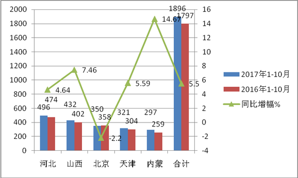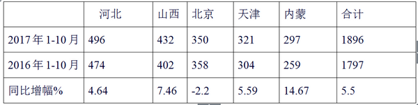 根据最新上牌数据统计分析,截止2017年前10月,华北区域的河北、山西、北京、天津、内蒙五大市场的 10-11米公路客车累计销售1896辆,比2016年同期的1797辆增长了5.5%,占据了全国10-11米公路客车市场近19.3%的比例。