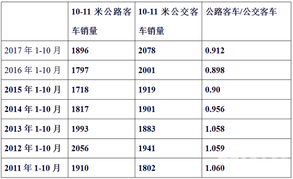 1、特点一:近7年前10月10-11米公路客车销量与对应区域同车长公交客车的比例几乎是1:1(下表数据来自上牌数据统计)