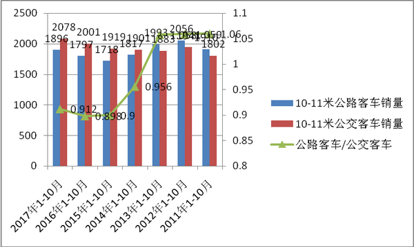 近7年1-10月:10-11米公路客车与公交车的销量比例均在0.898--1.06之间振荡,说明华北五大区域市场10-11米公路客车产品与公交车产品的比例始终保持了一个相对稳定的态势,比例最大的是2011年为1.06,最小的是2016年为0.898。而且在前3年10-11米客车自身的产品系列中,公路客车与公交车的比值一直大于1,比较稳定,且逐步下降的幅度几乎相近,但到了2014年1-10月,10-11米公路客车相对10-11米公交客车的的比值小于1(在上图曲线上表现更明显),2015年继续延续下滑规律,说明2015年10-11米公路客车相对10-11米公交车减弱明显加速,2016年1-10月这种趋势有变缓,2017年基本稳定,原因大致有: