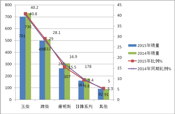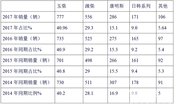 从上图表可知,2017年1-10月玉柴发动机占据了华北五大区域10-11米公路客车40.96%的比例,居于第一,且同比上升了0.06个百分点;其次潍柴发动机,占据了29.3%的比例,且同比也上升了0.1个百分点;进口发动机主要以康明斯为主,占据了15.1%的市场比例,其次日野发动机占据了9.0%。且同比分别下降了0.2和0.2个百分点。这给10-11米大型公路客车制造企业在五大区域市场营销方面提供了具体的参考依据。