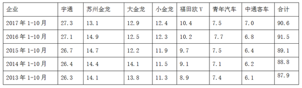 2017年1-10月三龙一通、青年、福田、中通等主流公路客车企业的10-11米公路客车总量占据五大区域市场的集中度为90.6%,而2016年同期其集中度为91.5%,同比集中度同比下降了0.9个百分点,一方面说明三龙一通等主流公路客车企业是上述五大区域10-11米公路客车的绝对垄断者,同时其垄断地位基本稳定,主要原因大致是: